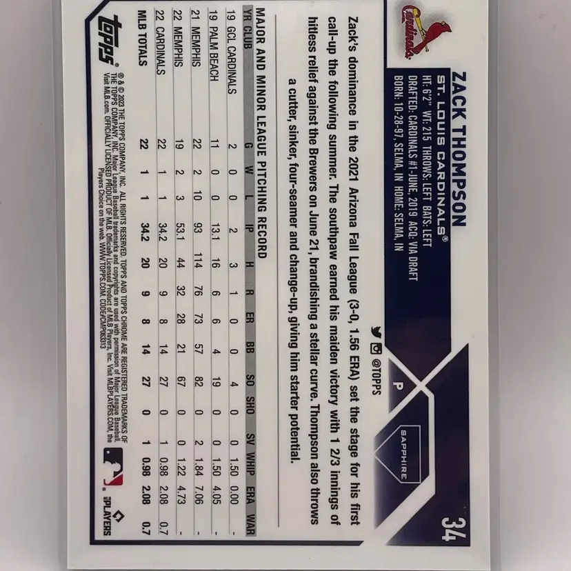 Zack Thompson, #34 Rookie Card St. Louis Cardinals 2023 Chrome Sapphire