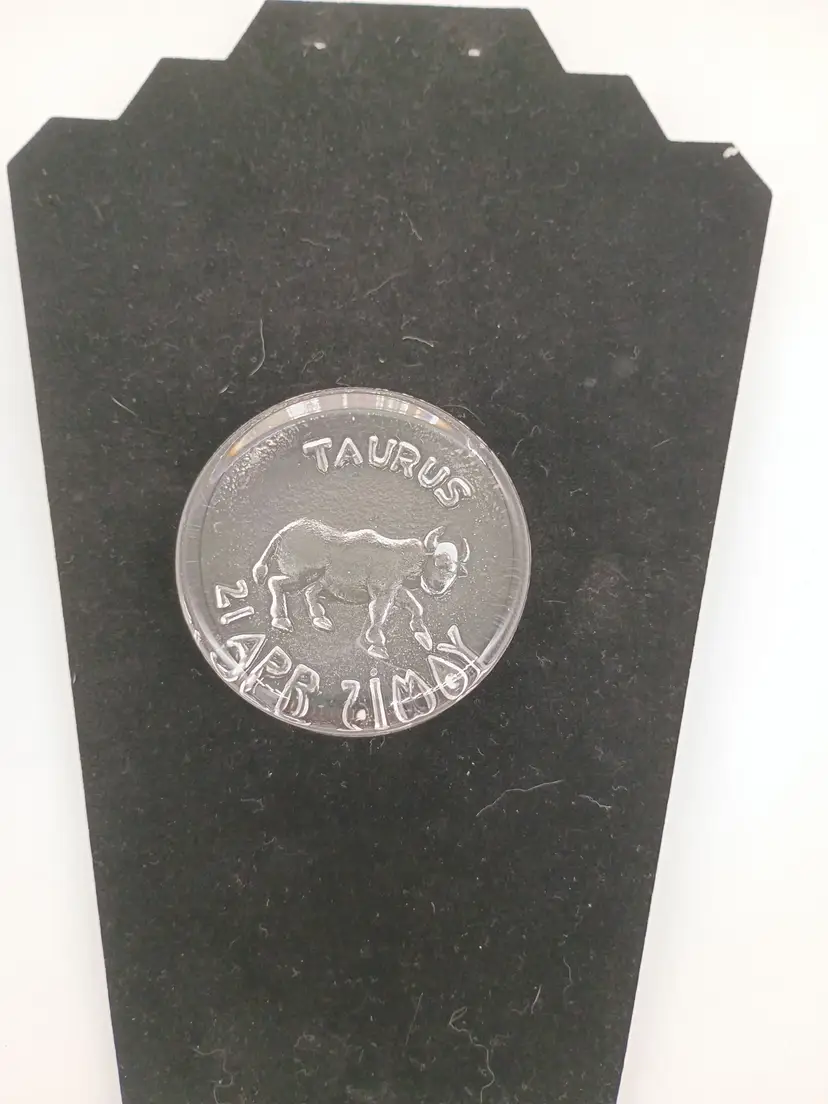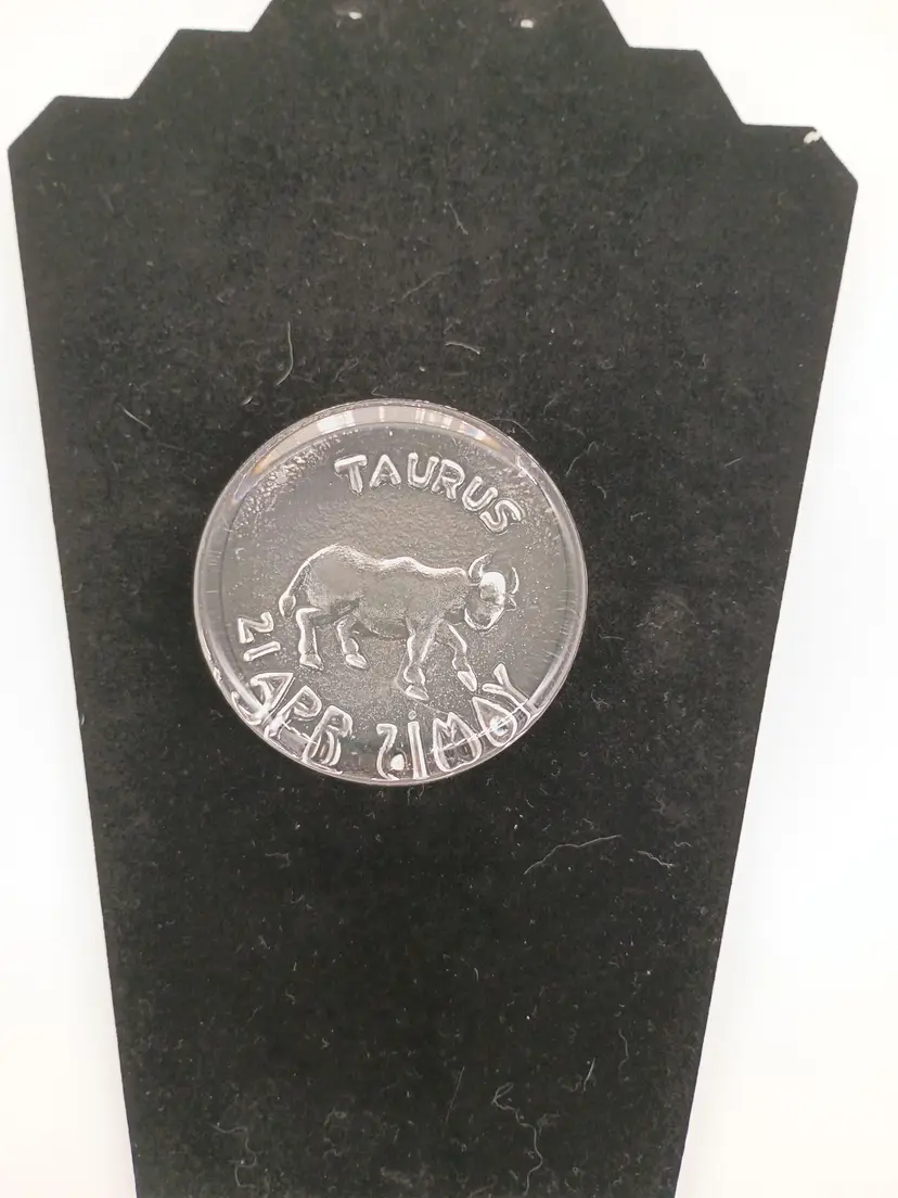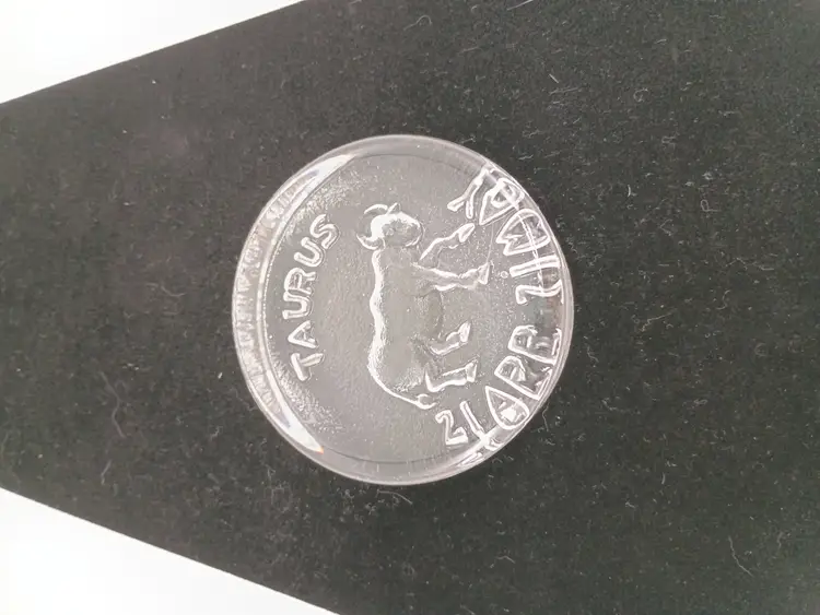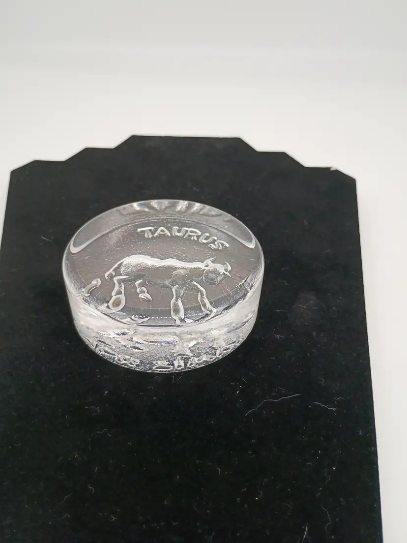 Zodiac Paperweight Taurus Dartington Clear Crystal Reverse Etch Design. Made in England. This is 3 inches in diameter and 1inch thick. This is preowned, No Chips Cracks or Flea Bites, No scuffs or scratches on display surface mild wear on back as expected. Excellent condition. Ships USPS domestically and UPS International Shipping globally